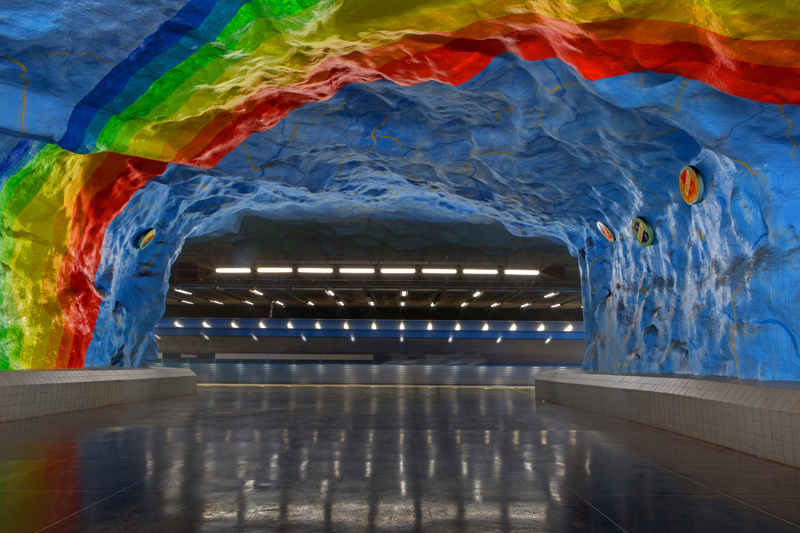 One of the most unique Metro systems in the world, Stockholm’s Tunnelbana is a work of art throughout. Many stations are designed to resemble deep, rocky caverns and have been painted in bright colors by a wide array of local artists, and the system has been dubbed the “World’s Longest Art Gallery.” Captured late at night and in the early hours of the morning, I’ve eliminated all people from the photos to focus on the unique art found along the system’s cave-like stations.